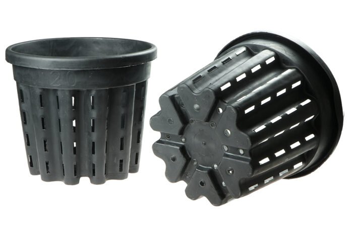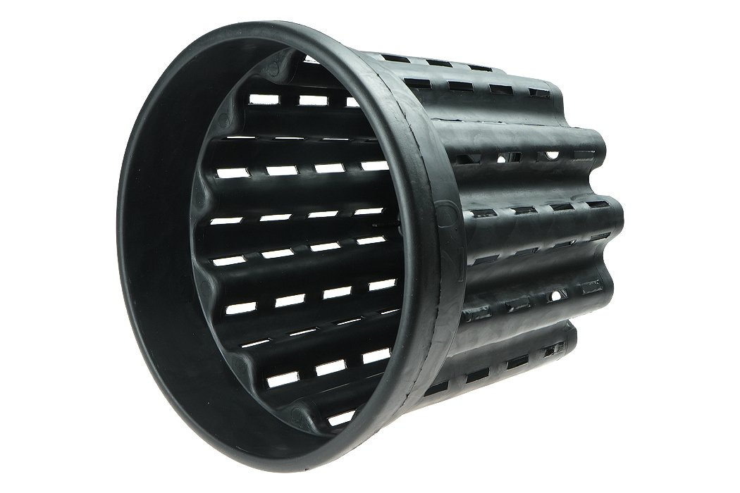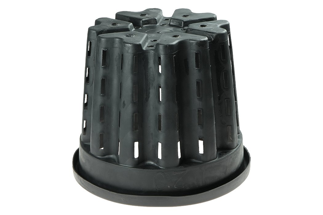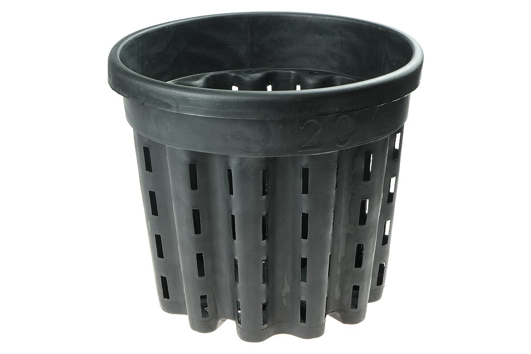Doniczka antyspiralizująca 20 l 33×28 cm to pojemna doniczka typu Air Pot przeznaczona do produkcji większych roślin wymagających intensywnego rozwoju systemu korzeniowego. Pofalowane ścianki oraz otwory rozmieszczone na całej powierzchni bocznej i w dnie skutecznie zapobiegają spiralizacji korzeni i wspierają równomierny rozrost bryły korzeniowej. Dzięki temu rośliny są silniejsze, zdrowsze i lepiej przygotowane do dalszej produkcji oraz przesadzania.