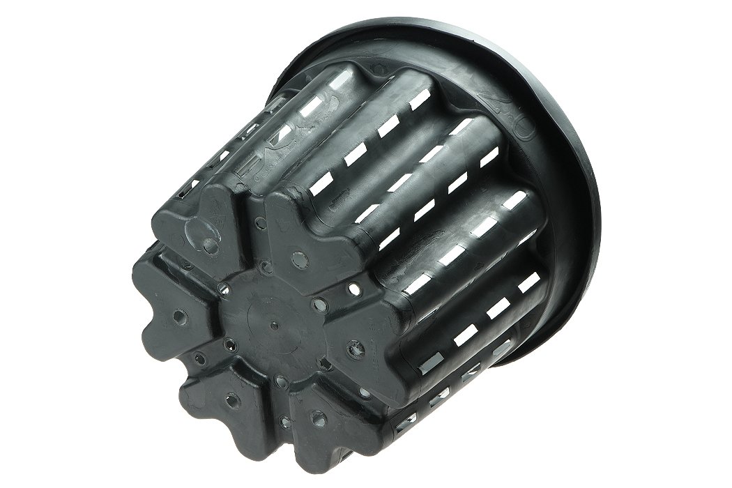 Doniczka wykorzystuje zjawisko przycinania powietrznego korzeni, które ogranicza ich zawijanie się po ściankach doniczki i stymuluje tworzenie nowych, drobnych korzeni w całej objętości podłoża. Otwory boczne zapewniają intensywną wymianę powietrza w strefie korzeniowej oraz szybkie odprowadzanie nadmiaru wody, co zmniejsza ryzyko chorób podłoża i gnicia korzeni. Pofalowana konstrukcja stabilizuje bryłę korzeniową i sprzyja równomiernemu rozwojowi roślin nawet przy dłuższym cyklu produkcyjnym.
