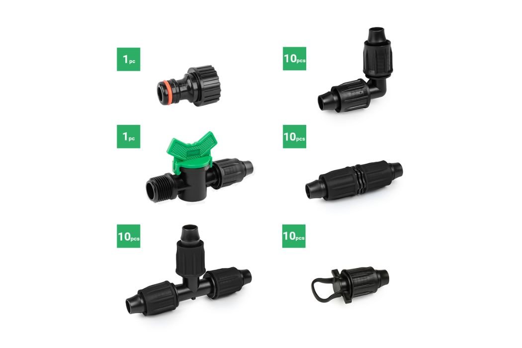 Komplet sprawdza się zarówno przy tworzeniu nowych linii kroplujących, jak i podczas modernizacji istniejących systemów. Elementy typu wtyk zapewniają szybki montaż bez potrzeby stosowania specjalistycznych narzędzi, co znacząco skraca czas instalacji.